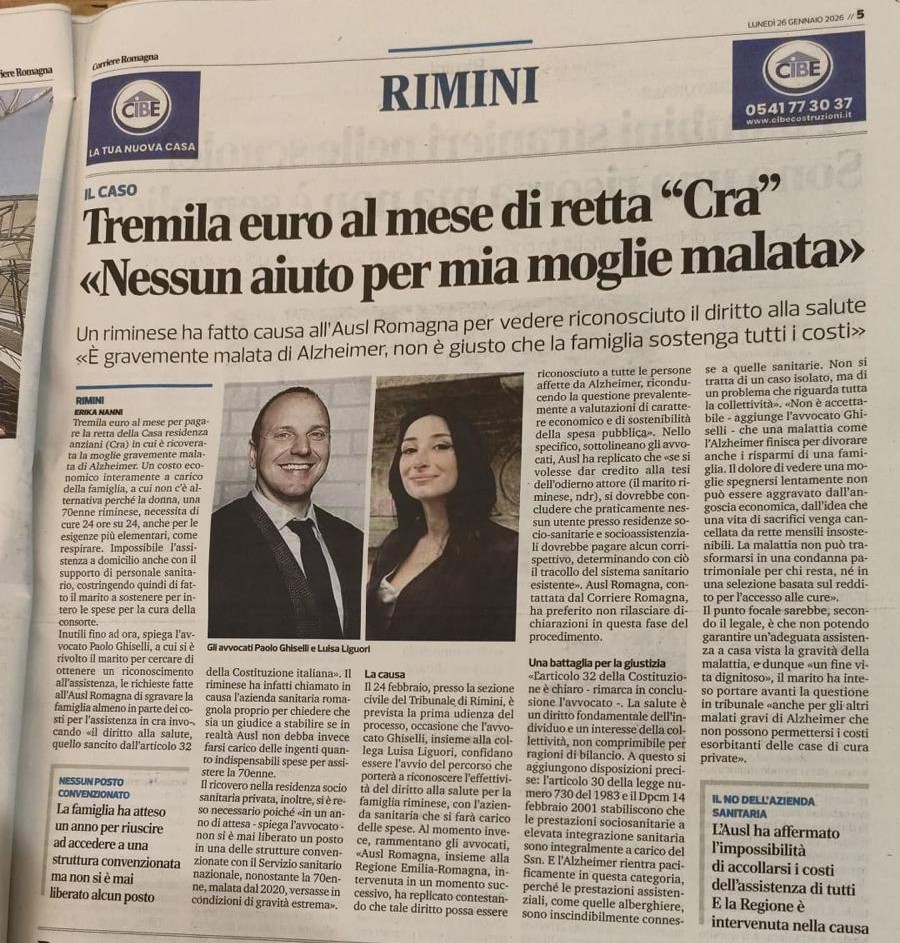 Come Studio diamo voce anche alle persone più deboli e questo è il caso che stanno attualmente seguendo l’Avv. Paolo Ghiselli e la Dott.ssa Luisa Liguori. Il nostro scopo è quello di tutelare il diritto di assistenza a questa tipologia di persone, affette gravemente dalla malattia di Alzheimer, anche alla luce della giurisprudenza che si sta consolidando. Essendo un tema di rilevanza politica, è stato anche oggetto di recenti interrogazioni parlamentari.